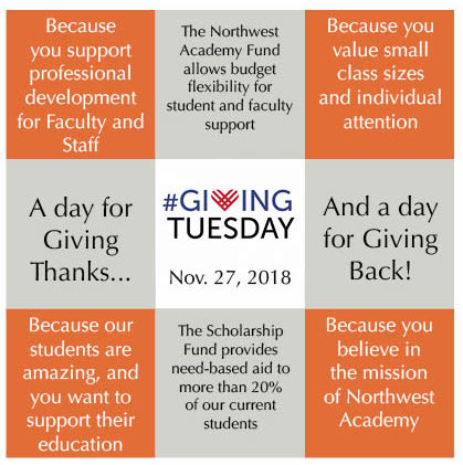 Your gifts on Giving Tuesday allow Northwest Academy to expand programs, open student access to special events and class trips, fund important scholarships, support advanced technologies in the classroom, provide professional development opportunities, and much, much more. We are so grateful for your generosity and support!